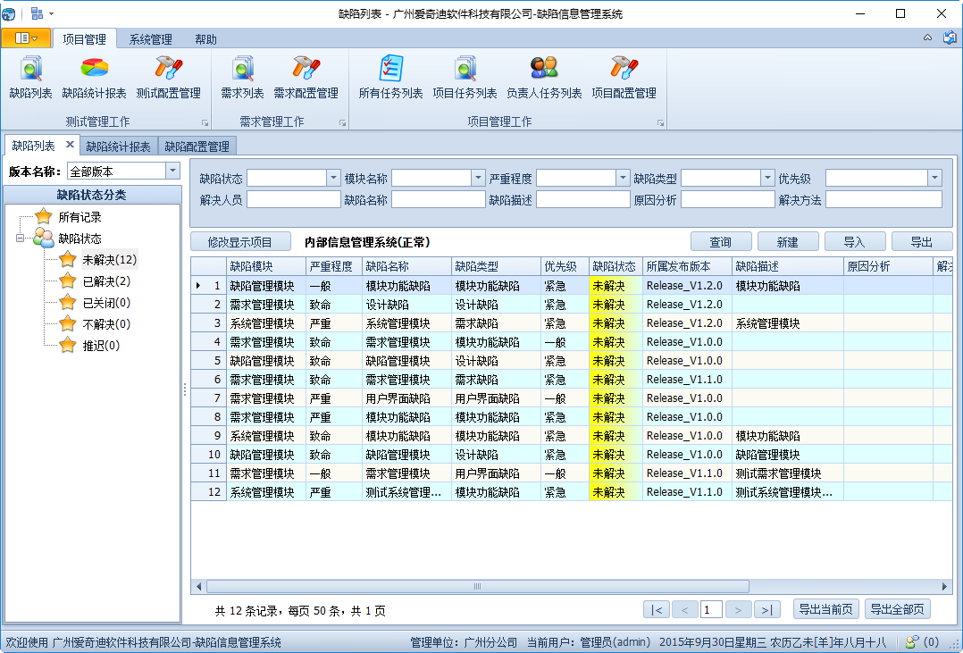 該軟件的功能包括:缺陷的維護(hù)管理(可上傳圖片)、項目列表維護(hù)、模塊列表維護(hù)、版本列表維護(hù)(數(shù)據(jù)字典維護(hù)(缺陷狀態(tài)、缺陷類型、緊急程度、優(yōu)先級)、用戶及功能權(quán)限管理、機(jī)構(gòu)數(shù)據(jù)權(quán)限管理等功能。軟件能夠規(guī)范項目開發(fā)過程中的缺陷記錄跟蹤流程、能夠根據(jù)不同的角色和機(jī)構(gòu)分配不同的缺陷,極大提高項目開發(fā)及管理水平。軟件界面美觀大方,方便使用。